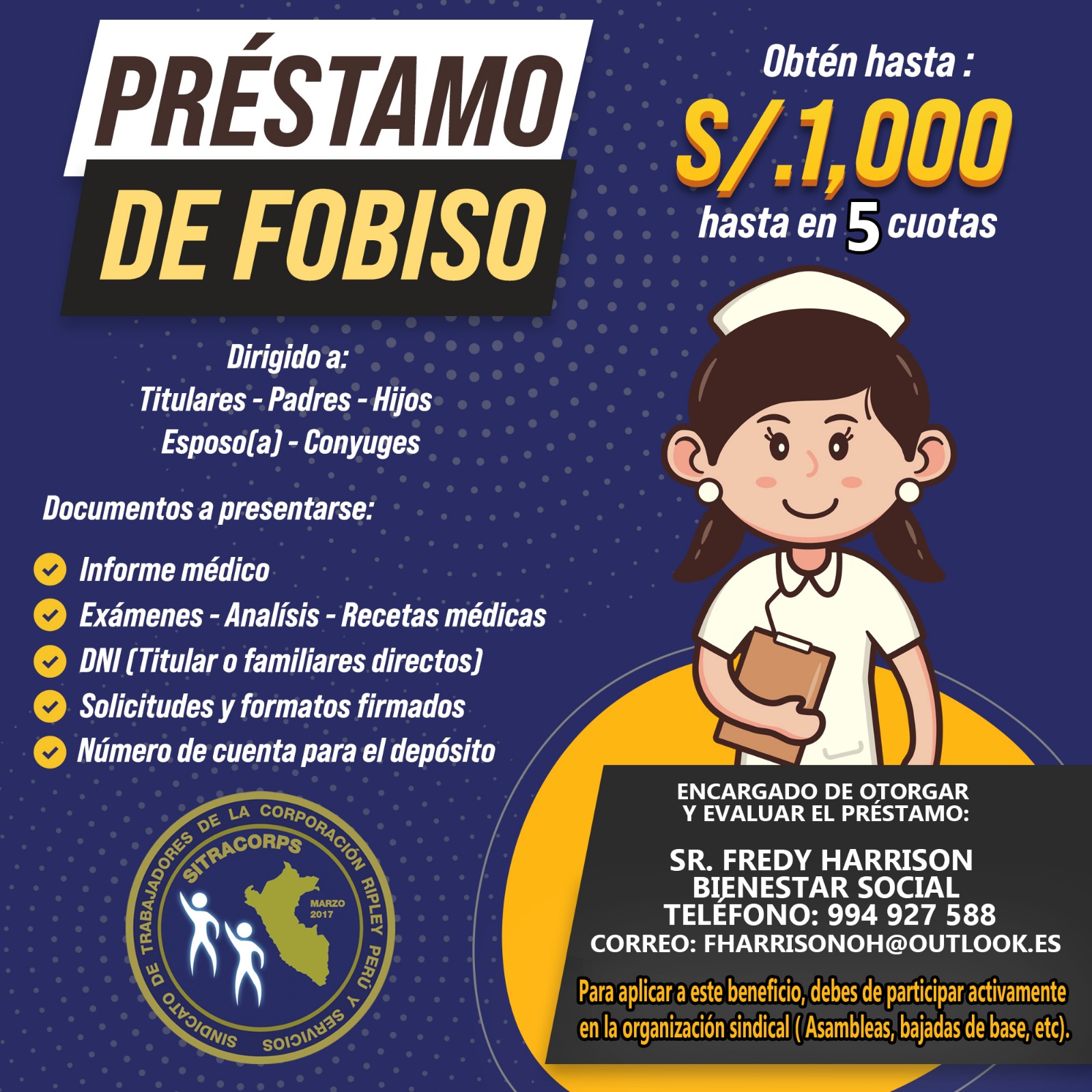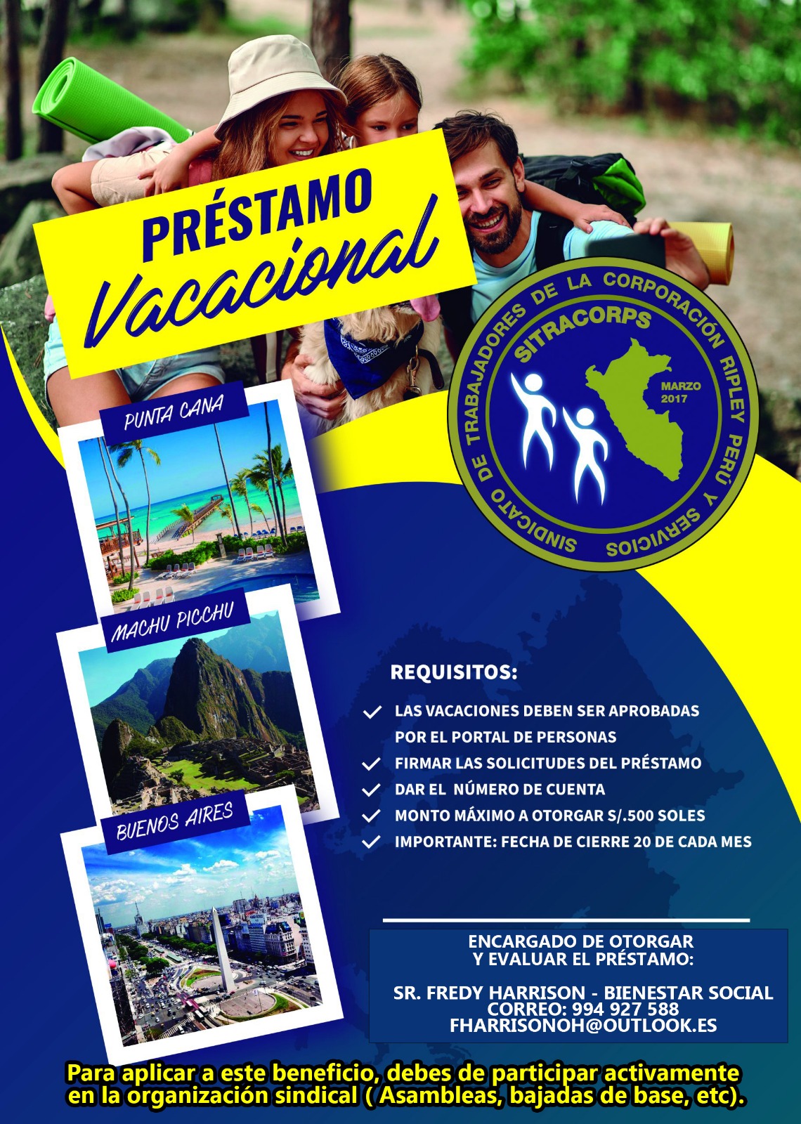 EI SINDICATO DE TRABAJADORES DE LA CORPORACIÓN RIPLEY PERÚ Y SERVICIOS es una organizaci6n de alcance nacional fundada el 07 de marzo del 2017 Expediente N 033880_2017 MTPE/1/20.2 con resolución ministerial 17 de marzo 2017, que está compuesta por los trabajadores de la empresa TIENDAS POR DEPARTAMENTOS RIPLEY PERÚ S.A, sujetos al régimen laboral de la actividad privada previsto en el Decreto Legislativo N° 728, constituida para la defensa y promocion de los intereses laborales, sociales, economicos y promocionales de los trabajadores. EI presente estatuto se aprueba al Amparo de la Constitución Política del Peru, en el T.U.O. de la Ley N° 25593 ampliatorias y modificatorias aprobado por Decreto Supremo N°-010 2003-TR y su Reglamento aprobado por D.S. N° 011-92-TR y en general por la normatividad legal peruana.